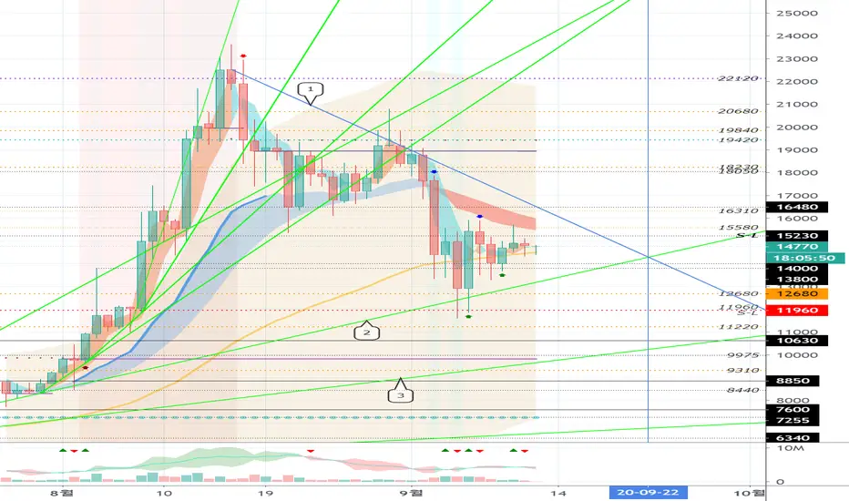 상승 추세선 (2) 와 하락 추세선 (1) 사이에서 수렴되어 진다면, 9월 22일경 (9월 21일-23일)에 변동성이 발생할 것으로 예상됩니다.