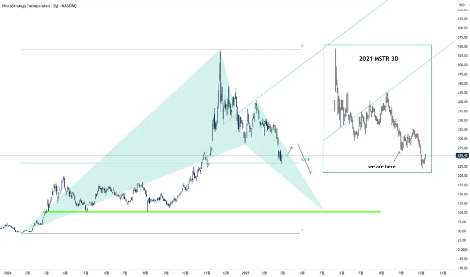 본문은 mstr 현재 일봉차트이며 오른쪽은 mstr 21년 3일봉입니다