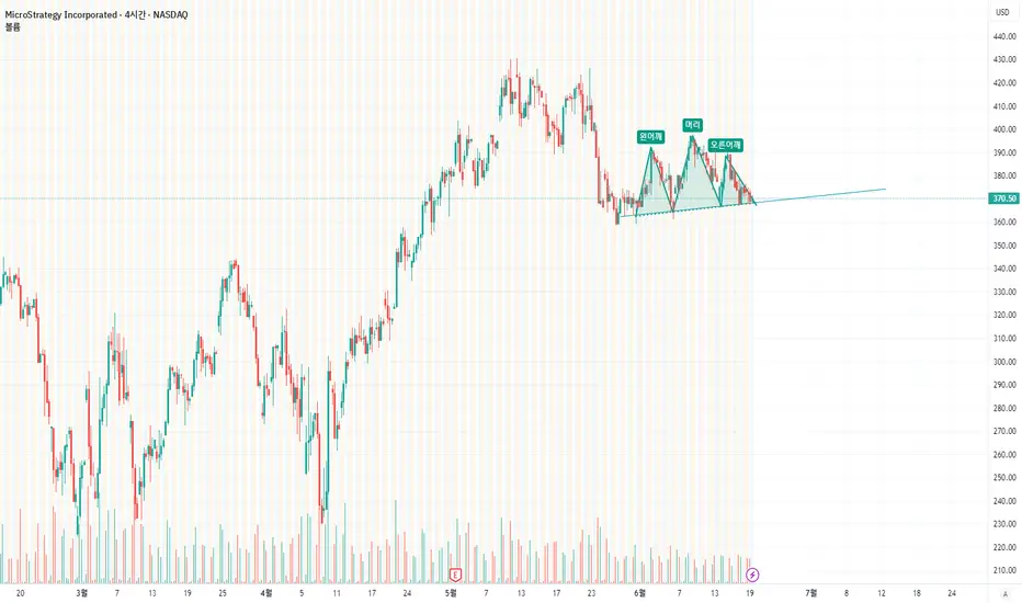 스트레티지는 현재 헤드앤 숄더 패턴이 보였는데요. 거래량도 일정하게 나와주고, 지금은 넥라인에 걸쳐서 약간의 반등이 나왔습니다. 물론 봉1개정도의 반등입니다. 다만, 헤드앤 숄더 패턴이 맞기 위해서는 이대로 떨어져야 하겠네요.