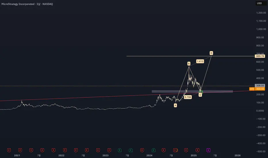 또한 MSTR의 반등이 강하게 나왔을 경우, 피보나치 되돌림 비율로 인해 나올 수 있는 AB=CD Pattern 중 0.707% 되돌림 패턴으로 판단할 수 있습니다.