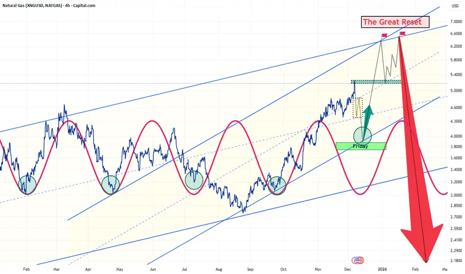 From a technical perspective, Natural Gas is nearing a high-conviction inflection point. The weekly hammer that will be formed into Friday’s close (12.12.2025) indicates a potential shift in market structure following the optimal accumulation zone around 4.9. This configuration favors a sharp, impulsive rally over the next 2–3 weeks, with a likely target at the long-term channel resistance near 6.4. The emerging double-top formation suggests a setup for a notable momentum reversal.