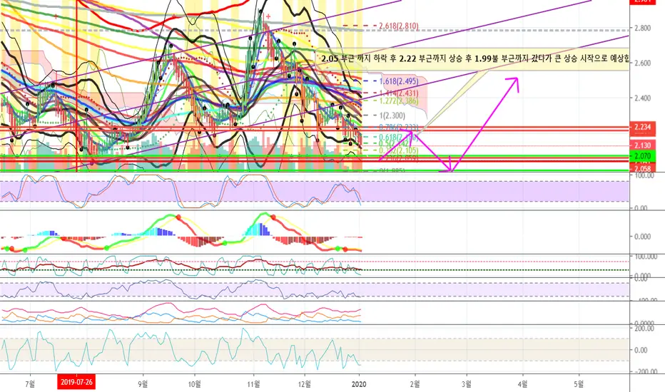 현재 구간이 과거 2019년 7월 26일 구간과 비슷한 양상을 보여주고 있으며 그 패턴이 반복 됐을 경우 예상 경로는 2.05 부근 까지 하락 후 2.22 부근까지 상승 후 1.99불 부근까지 갔다가 큰 상승 시작으로 예상합니다. 일봉의 하락 피보나치 목표가와 현재는 하락 3파동진행중으로 보고 있고 추가로 볼린져밴드를 통해서 가격대를 분석했습니다.
