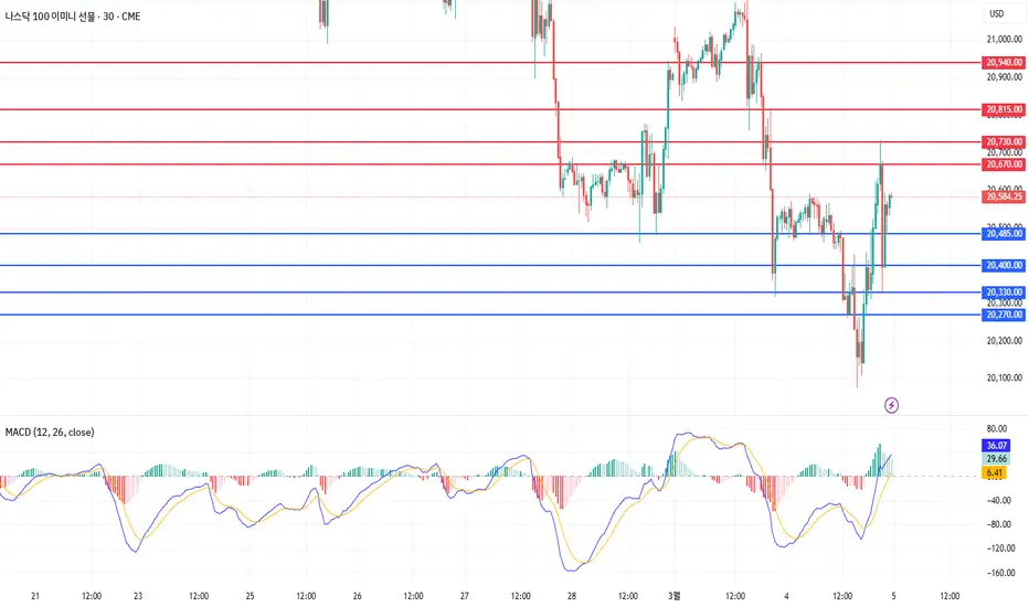 나스닥은 관세 이슈로 시장의 변동성이 확대되며 하락마감하였습니다. 일봉상 240일선을 하회하였으나 아래꼬리 달며 바닥을 다지는 움직임이 나타났습니다. 연결선물로는 240일선이 20000을 조금 밑도는 수치인데, 20100~20000 구간에서는 그동안 급락세에 따른 지지반등이 나타날 가능성이 높으니 주가가 해당 구간까지 하락한다면 스윙 매수 기회로 삼아볼 수 있을듯 합니다. 일봉의 MACD와 Signal선이 가파르게 하락하고 있기 때문에 주가가 반등하면서 MACD와 Signal선의 이격과 각도 등을 줄여가는 박스권 작업이 필요할 것으로 보입니다. 어제 아래꼬리를 강하게 달고 반등했기 때문에 프리장에서 눌림 준다면 눌림 시 매수 대응해볼만 하겠으며, 반등할만한 모멘텀으로 오늘 ADP비농업고용 지표와 금요일 비농업고용지표 등을 고려해볼 수 있겠습니다. 240분봉상으로는 다이버젼스를 만들면서 다시 골든크로스를 만들어가는 구간이라, 눌림 시 매수 위주로 대응하는 게 현재 구간에서는 유리하겠습니다. 즉 추격매도는 주의하며 매수를 보기에 매력있는 구간까지 내려왔다고 보시면 되겠으며, 박스권 대응을 하되 눌림 시 매수 대응이 유리하겠습니다.