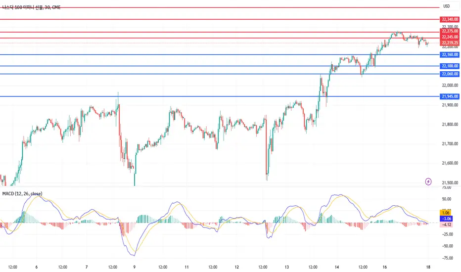 ※주요 지지, 저항 라인에서는 나스닥은 5pt, 오일/골드는 5틱 이내 진입가능 구간으로 체크합니다.