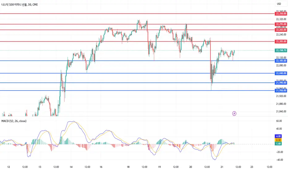나스닥은 월마트 실적발표로 인한 소비둔화 우려로 하락마감하였습니다. 금요일 주봉을 마무리하는 날인데, 주봉상 아직 매수시그널이 나오지 않은 상황이니 만큼, MACD가 하방으로 향하게 되면 추가적인 하락 가능성이 높아졌습니다. 일봉상으로는 10일선 부근이 2월 초까지 형성되었던 박스권의 상단인 만큼 눌림자리에서 지지해주는 모습이며, MACD는 아직 매수 시그널이 유지중이라 볼 수 있습니다. 다만 현재 수급이 혼조세를 보이는 구간이라, 음봉과 양봉이 번갈아가며 나타나는 장세가 펼쳐질 가능성도 높습니다. 즉 전고점을 강하게 돌파하는 장대양봉이 나오기 전에는 현재 구간을 박스권으로 보는 게 유리하겠으며, 아직은 매수우위지만 일봉의 MACD가 매도시그널이 발생하는지를 보면서 매도우위 여부를 확인하는 게 좋겠습니다. 240분봉에서도 MACD의 하락이 거세게 나오는 상황으로, 매수세가 많이 없는 모습입니다. 아직 240분봉에서 Signal선이 0선 위에 있기 때문에 21800과 21900 사이에서는 매수반등 시도가 나올 수 있겠으며, MACD와 Signal선의 이격이 벌어지는 그림이 지속되면 상승하더라도 매수추격에는 유의하는 게 좋겠습니다