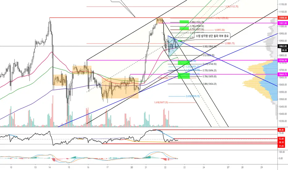 - 검정색 하락 채널 상방돌파 시도중입니다. 돌파 성공 시 파란색 하락 추세선 (삼각형 상단)의 저항을 테스트하러 갈 가능성이 높습니다. 현 기준 10895~10905입니다.