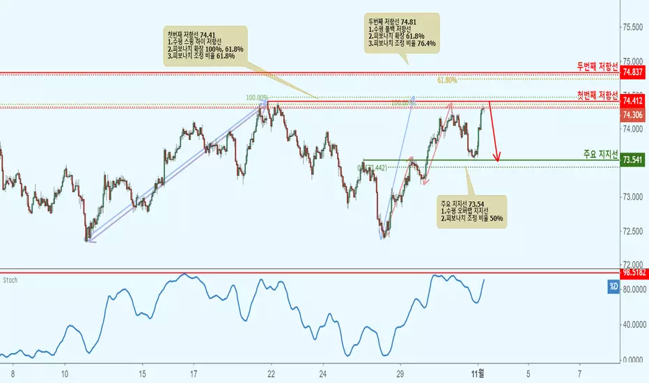NZDJPY 가격은 첫번째 저항선 74.41(수평 스윙 하이 저항선, 피보나치 확장 100%, 피보나치 조정 비율 61.8%)에 접근하였으며 이 수평선의 반응으로 인해 주요 지지선 73.54(수평 오버랩 지지선, 피보나치 조정 비율 50%)까지 하락 할 가능성이 있습니다.