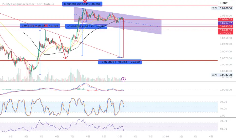 펏지펭귄(PENGU)은 지속적으로 하락을 안내해 왔으며 상대적으로 큰 하락이 발생하였습니다. 이제 상승하기는 어렵다 보고 있으며 지속적인 우하향이 발생할 가능성이 매우 커졌습니다. 따라서 저배율 숏으로 바닥까지 가지고 가보시길 바랍니다.