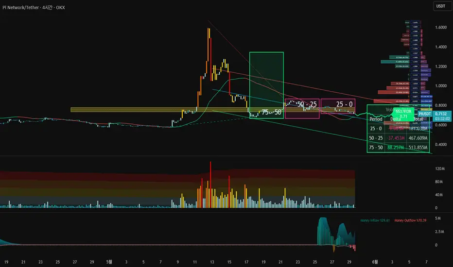 ③⚠️ 거래량 추세는 진짜 심각함. 최근 25~50% 가격대 구간에서 -37.45M(약 4천9백만 개) 물량이 빠져나가면서 매도세가 압도적이었음. 이 때문에 가격이 추가로 밀릴 가능성도 무시 못 하지만, 지금 저점권 지지라인이 강해서 버티고 있는 상황.