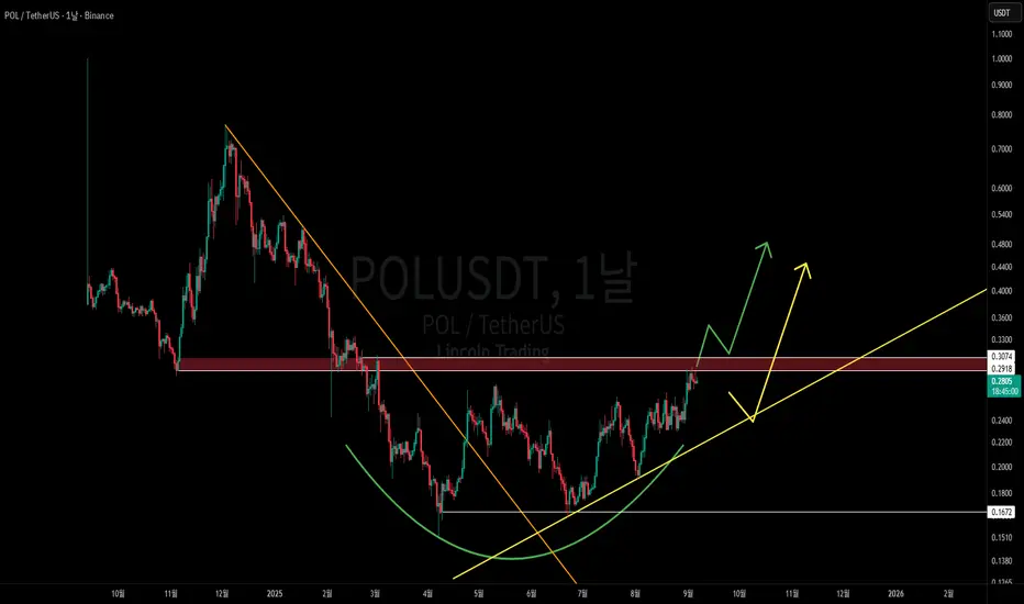 폴리곤은 'MATIC'에서 'POL'로 리브랜딩 이후 '약 1년간 약세' 흐름을 이어왔습니다. 하지만 이 과정속에서 상승 패턴을 형성했는데, 차트를 보시면 저점을 둥그렇게 돌려나가는 'Rounding Bottom' 혹은 상승형 삼각형인 'Ascending Triangle' 패턴을 형성 중입니다.