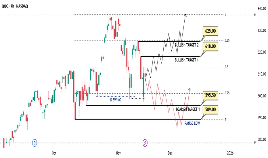 If we see strong selling on Monday, I will assume price may follow the bearish path. In that case, I expect a move toward 595.5 and then the range low at 589. From there, we could see a bounce and a reclaim of 595.5.