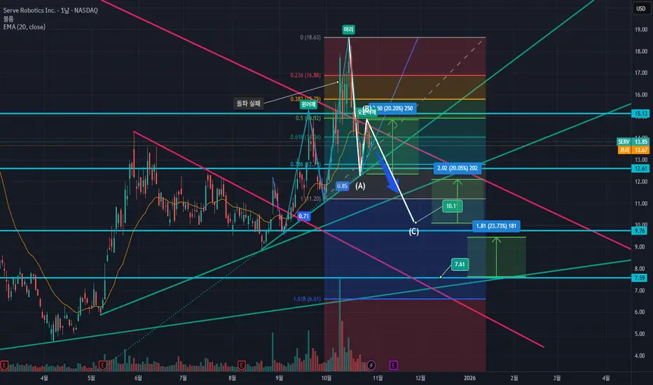 해당 위치는 엘리엇 코렉션 웨이브 ABC의 A파와 B파의 비율이 1:1이고 매물대가 존재하기 때문에 단기 반등을 기대하고 매수로 접근 아래로는 짧게 잡고 위로는 20%의 수익을 기대한다