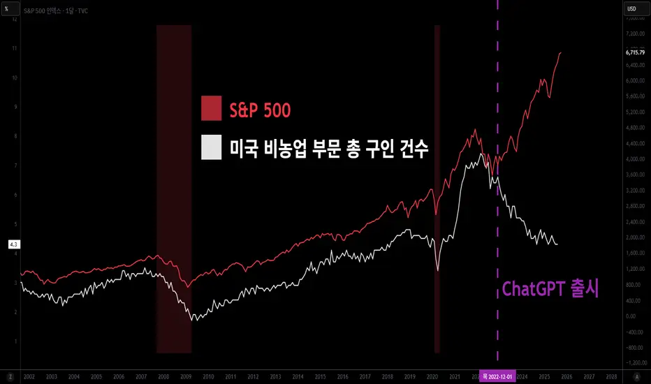 경기 확장기에는 고용이 늘고 증시도 상승하는 구조였으나, 현재는 구인 건수가 뚜렷하게 줄어드는 반면 S&P500은 AI 투자 열풍으로 사상 최고치를 경신하고 있습니다.