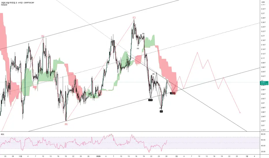 크립토 토탈마켓캡 구조 정리 · 반등 분기 구간고점 이후 흐름은 하락 임펄스 파동 관점을 유지하고 있습니다.