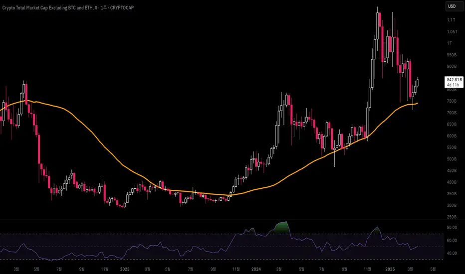 위 차트는 지난 3년 동안의 전체알트시총(ETH시총 제외)과 키레벨 50주 이평선 등을 한데 모은 차트입니다. 여기서 알수있는건 알트시총이 '23.4분기에 키레벨 50주 이평선을 상방돌파후 해당 이평선의 강력한 지지를 받아왔다는 겁니다