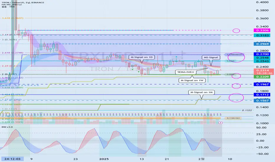 또한, 1W 차트의 M-Signal 지표가 0.2209 부근을 지나고 있으므로 중요한 지지와 저항의 역할을 보여주고 있습니다.