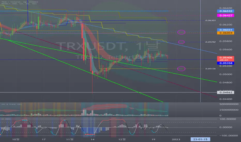 0.05358 부근에서 지지 받고 0.06004 이상 상승할 수 있는지가 관건입니다.