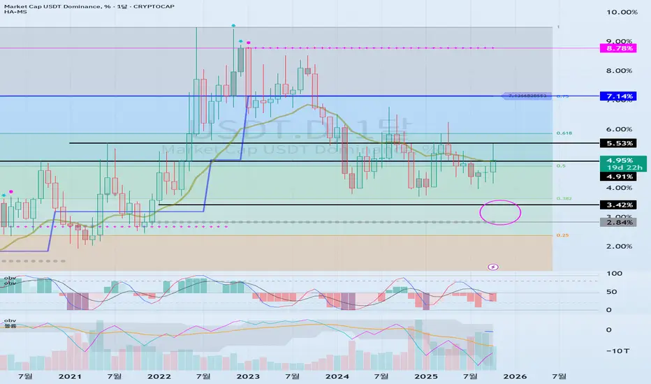 USDT 도미넌스가 4.91 이하에서 유지되거나 하락세를 보인다면 코인 시장을 상승세를 보일 가능성이 높습니다.
