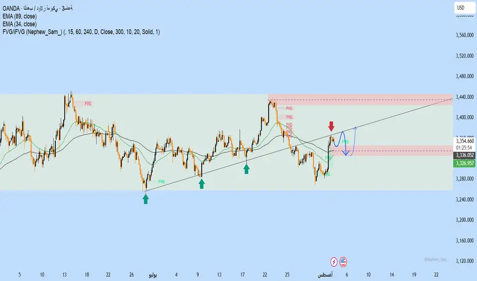 السعر حالياً يختبر خط الاتجاه الصاعد السابق، وقد يشهد تذبذباً محدوداً قبل محاولة الصعود نحو منطقة المقاومة التالية قرب 3380.