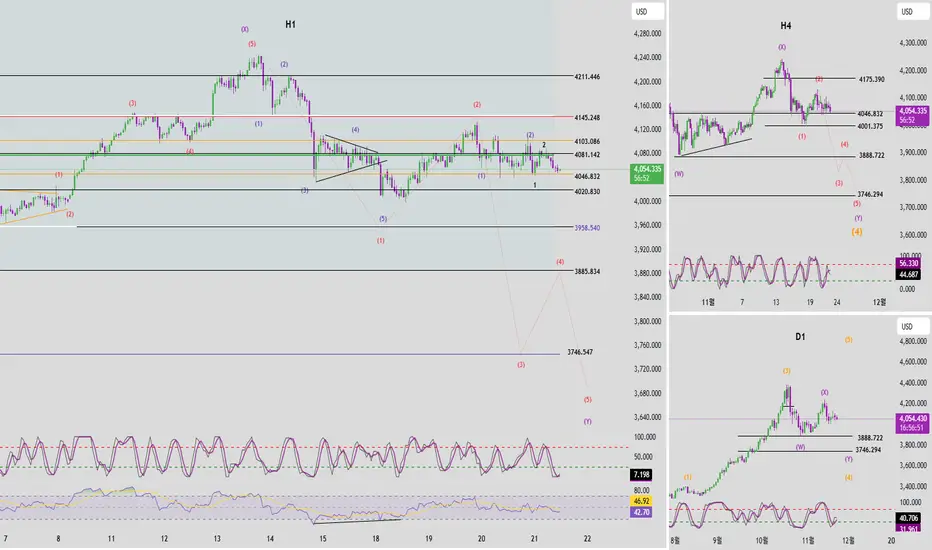 • 가격이 계속 횡보하고 4001을 돌파하지 못한 상태에서 H4 모멘텀이 과매도에 도달한다면, 현재 움직임은 파동 2의 ABC 조정 중 B파일 가능성이 큽니다.