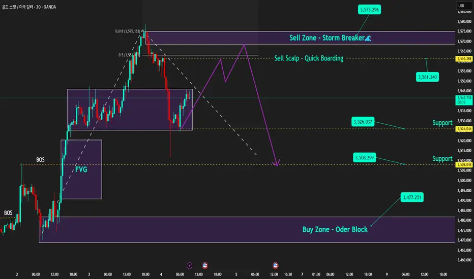 🌊 Storm Breaker (매도 구간 3,573 – 3,575): 피보나치 0.618–0.786 저항과 겹치는 구간 → 강한 매도 압력 예상.