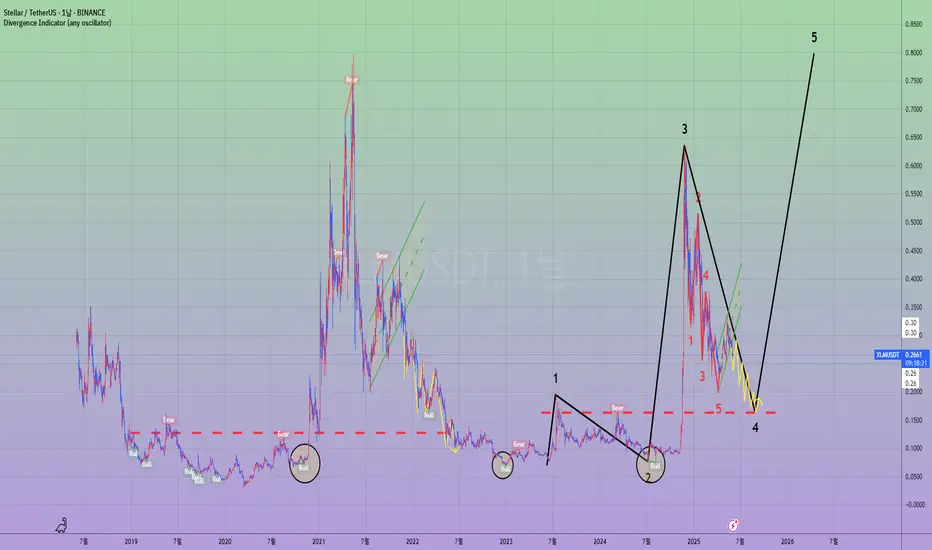 차트의 기술적 분석과 함께 살펴봐도 상승의 5파 잠재력을 지니고 있습니다. 그러나 중요한 것은 현재 저점이 확인되지 않았기 때문에 매수에는 주의가 필요합니다. 매수를 하기전에 충분한 하락을 기다리고 상승다이버전스의 출현을 크로스 체크합니다. 이러한 과정을 통해 스텔라루멘(XLM)에서 10배 이상의 상승을 바라볼 역사적 저점을 잡아낼 수 있을 것입니다.