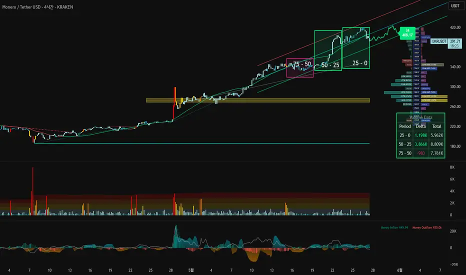 3️⃣📊 볼륨 데이터를 세부적으로 보니까 최근 핵심구간(가격 350~~400달러)에서 매수세가 압도적으로 강했음. 최근 50~~25구간에서만 +3.866K 볼륨 델타(순매수 우위) 발생. 이게 의미하는 건 현재 모네로 시장에서 '강력한 매수벽'이 존재한다는 거야💰