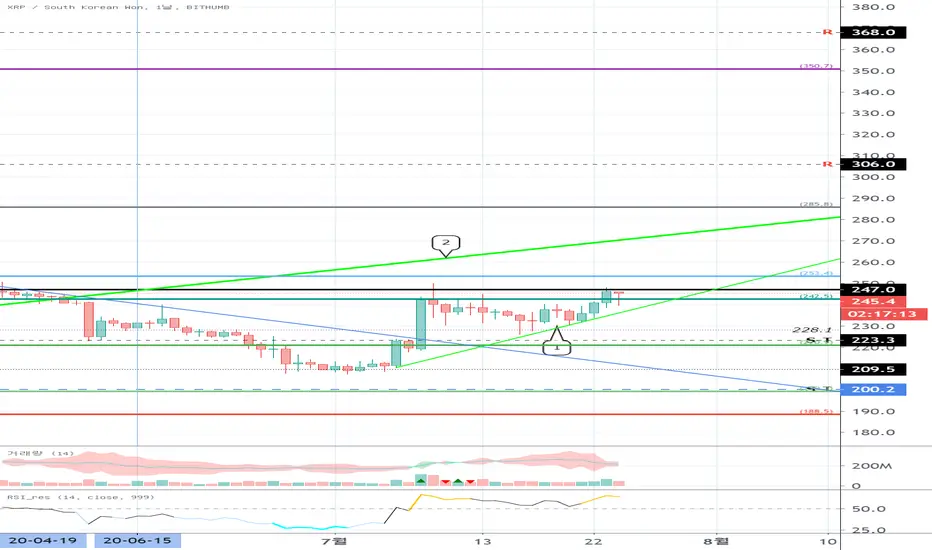 또한, 242.5 - 253.4 구간에서 힘을 모아서 상승 추세선 (2)을 돌파할 수 있는지 지켜봐야 합니다.