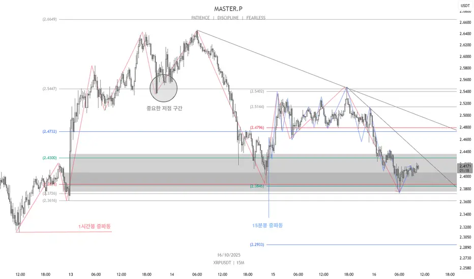 저는 현재의 움직임에서 상승의 시그널을 파란색 파동의 크기정도로 저점을 올려두는 형태가 나올때 롱포지션에 대한 관점으로 진행 할 것이고