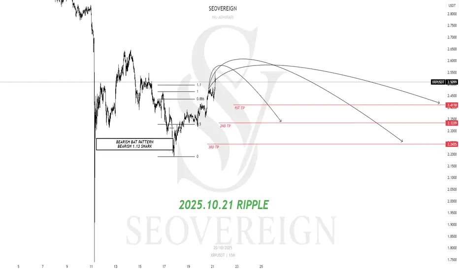 리플은 현재 BEARISH BAT 패턴과 BEARISH 1.13 SHARK 패턴이 동시에 완성된 구간에 위치하고 있습니다.