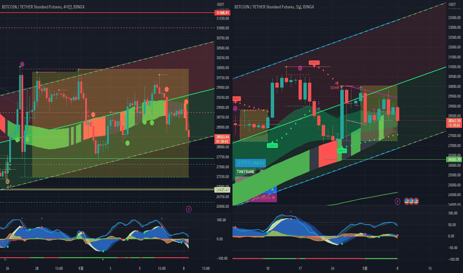 현재 28K~28.2횡보하는 이유는 4시간봉 大 추세대 하단을 터치했기 때문입니다.