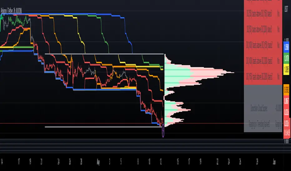 This indicator contains a set of 5 Donchian channels (upper, lower, and basis plotted) defaulted to lengths of 25, 50, 100, 150, and 200. A set of conditions associated with the channels aims to determine ranging versus trending markets. Weights are given to these conditions accordingly, then tallied up to determine the "cloud score", ranging between -25 and 25. For the purposes of this indicator, a ranging market is determined by a cloud score between -10 and 10, while a positive trending market has a score higher than 10 and a negative trending market has a score lower than -10. This score is accompanied by altered bar color to reflect the score - gray for ranging markets, green for positive trending markets, and red for negative trending markets. Breaking of upper or lower Donchian bands is typically a good indication of a potential breakout. Having a weighted system for these conditions will provide more insight and layers of confirmation into a Donchian breakout trading strategy. The table will reflect these values through positive, negative, and neutral coloration.