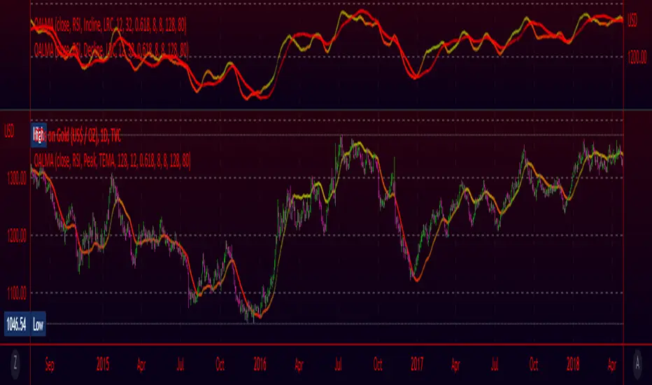 This moving average uses an oscillator to influence the length used during calculation. Extremely customizable/tunable with ability to change Max and Min length values, length multiplier, length multiple,4 different settings ,( <Incline, >Decline , <>Peak, ><Trough), many of the moving averages seen in the library above,+ linear regression curve and the standard ta.wma.