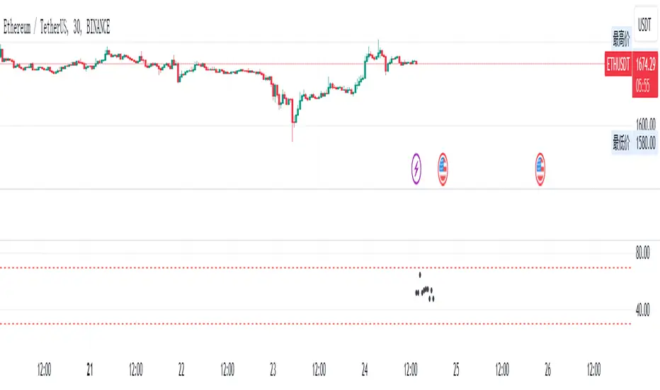 1. It displays 40 items’(tokens,stocks, futures etc.) RSI oversold and overbought data in the form of bitmap/dots on the chart.