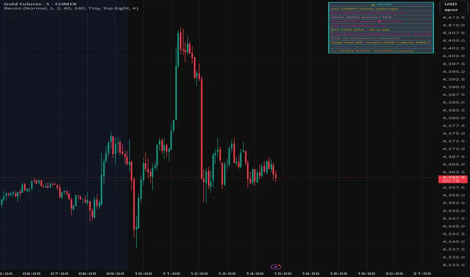 Recon is a market state synthesis and interpretation tool designed to summarize multiple analytical dimensions into a single, readable overview. Instead of presenting raw indicator values, Recon translates trend, momentum, volume, and structure conditions into descriptive market states.