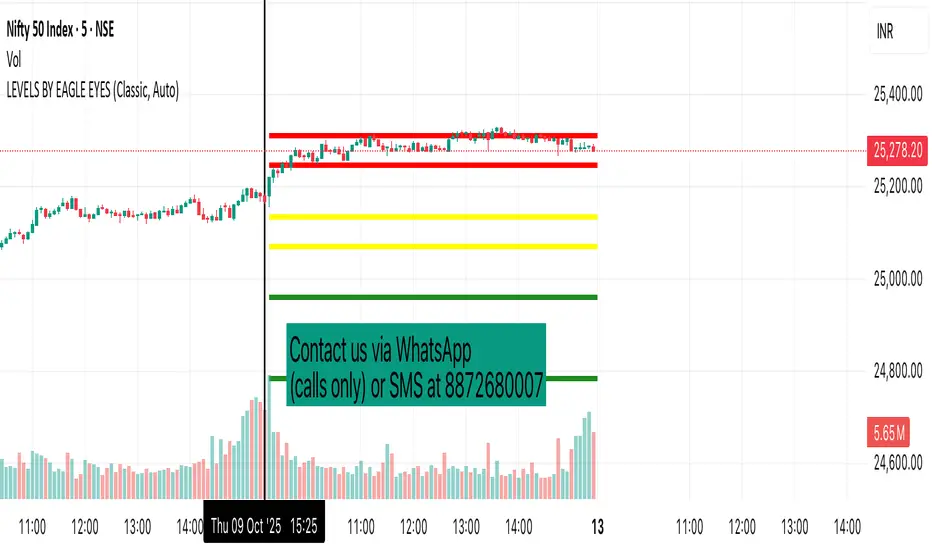 EAGLE EYES BY LEVELS is a precision price-action tool designed to identify and plot key market levels where price is most likely to react. It combines intraday, swing, and positional support–resistance zones with live market structure analysis, helping traders quickly spot high-probability setups without chart clutter.