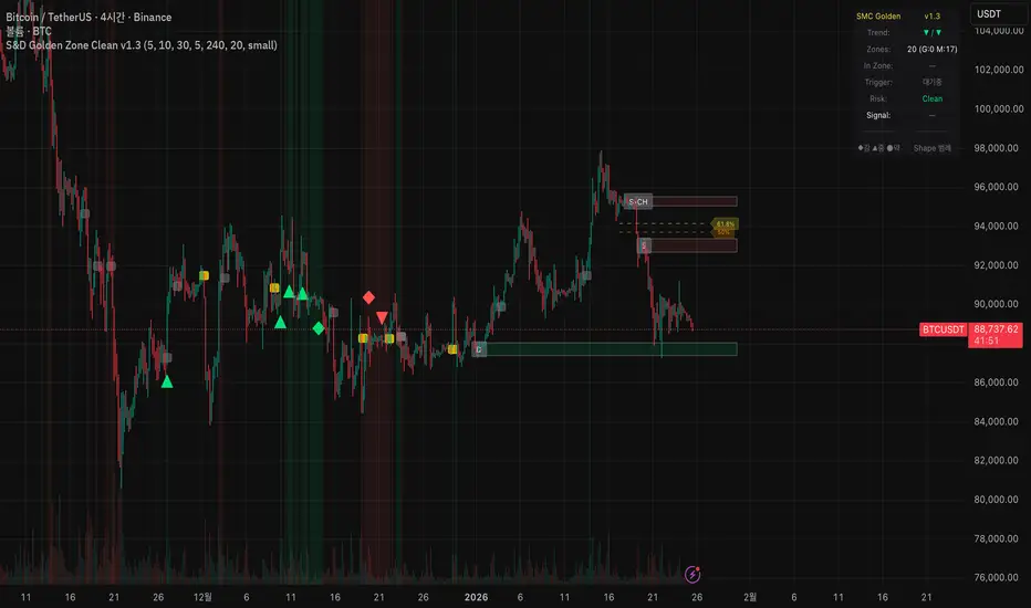 Unlike standard SMC indicators, this "Clean Edition" focuses on "Golden Zones"—where Order Blocks (OB) align with key Fibonacci retracement levels (50% - 61.8%).