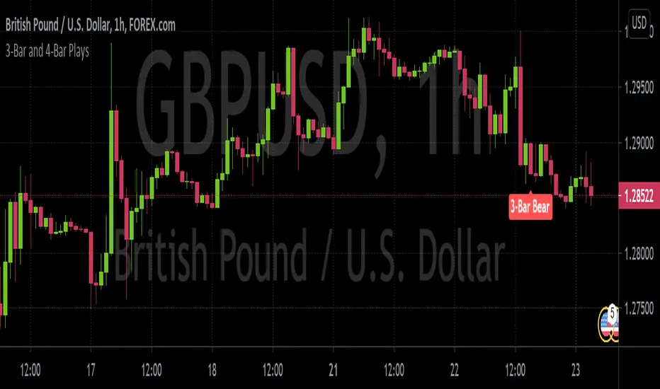 This indicator helps identify 3-bar and 4-bar plays, which are price action patterns consisting of a wide ranging bar that breaks above or below resistance or support, followed by one or two collecting/consolidating bars, then a continuation bar in the direction of the new trend. The 3 and 4-bar play is taught by Jared Wesley and Anmol Singh at Live Traders.