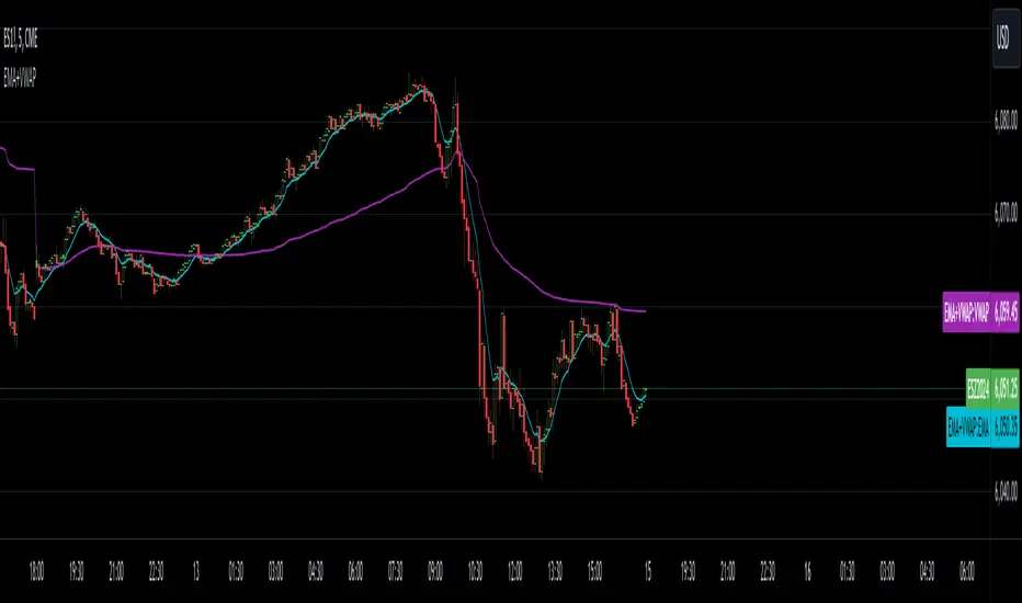 This indicator combines two popular technical analysis tools: the Exponential Moving Average (EMA) and the Volume Weighted Average Price (VWAP), into a single, powerful overlay on your chart. It allows you to analyze both trend direction using the EMA and institutional interest and fair value using the VWAP, all while saving valuable indicator slots on your TradingView layout.