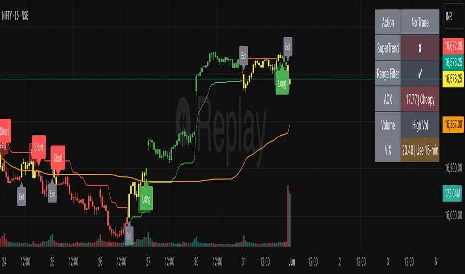 A Multi-filter trend-following system designed specifically OPTION SPREAD STRATEGY in NIFTY and Indian Indices - Works by combining price action, volatility, and market regime awareness to reduce whipsaws while capturing strong trends. The indicator dynamically adapts to market conditions using real VIX data and enforces disciplined entry/exit rules based on confirmed signals.Adaptive Timeframe Guidance