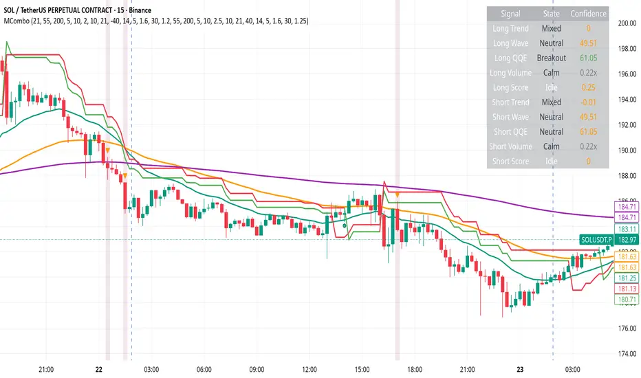 Tracks EMA stacks, SuperTrend, WaveTrend, QQE, and volume to score bias.