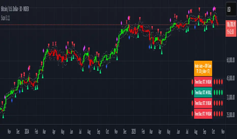 Sicari is a trend-following trading system that identifies potential bullish or bearish trends. It blends EMA trend, OBV participation, and an Adaptive SuperTrend gate (machine-learning k-means over ATR bands) into a strict 2-of-3 confirmation model.