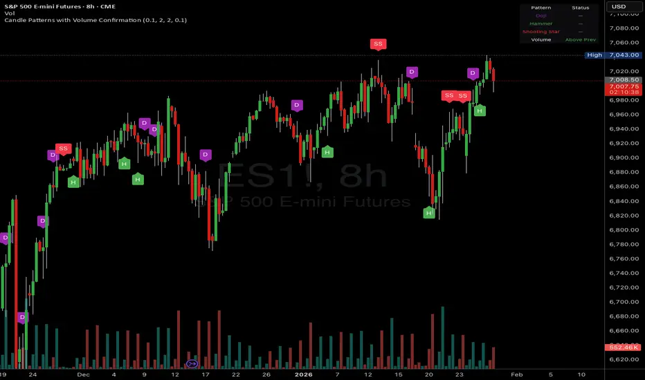 Patterns only trigger signals when volume > volume[1] (current candle volume exceeds previous)