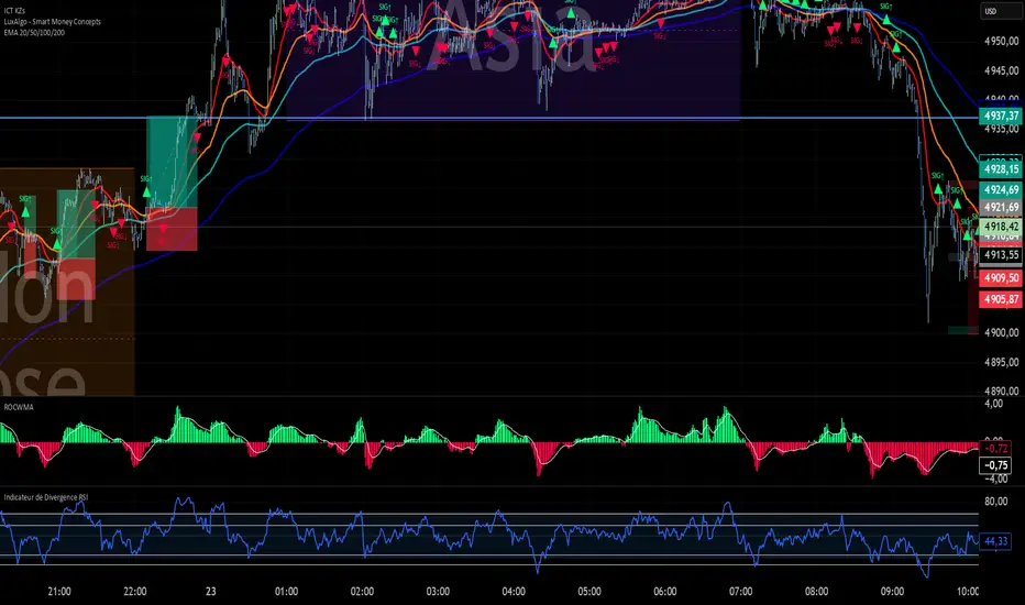 The ROC-Weighted MA Oscillator (ROCWMA) is a momentum-driven oscillator designed to expose hidden acceleration and deceleration phases in price action by dynamically weighting a moving average with the normalized Rate of Change (ROC).