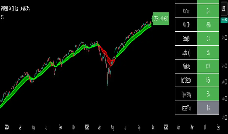 The Adaptive Trend Selector is a comprehensive trend-following tool designed to automatically identify the optimal moving average crossover strategy. It features adjustable parameters and an integrated backtester that delivers institutional-grade insights into the recommended strategy. The model continuously adapts to new data in real time by evaluating multiple moving average combinations, determining the best performing lengths, and presenting the backtest results in a clear, color-coded table that benchmarks performance against the buy-and-hold strategy.
