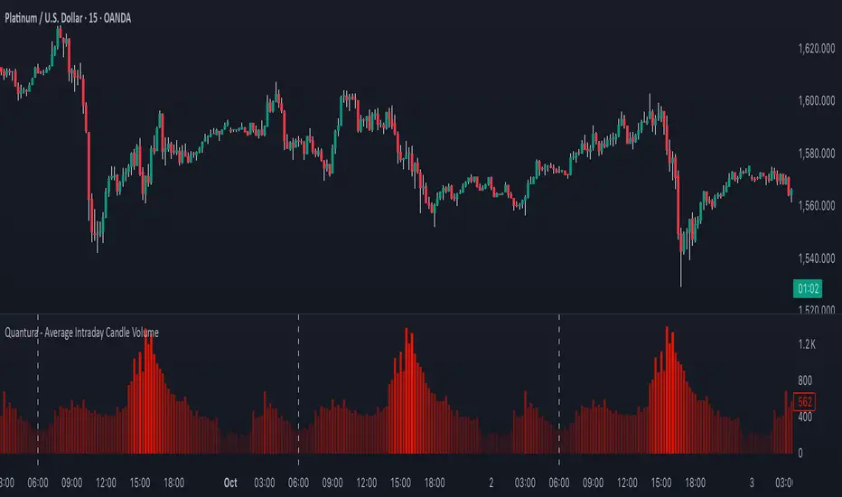 “Quantura – Average Intraday Candle Volume” is a quantitative visualization tool that calculates and displays the average traded volume for each intraday time position based on a user-defined historical lookback period. It allows traders to analyze recurring intraday volume patterns, identify high-activity sessions, and detect liquidity shifts throughout the trading day.