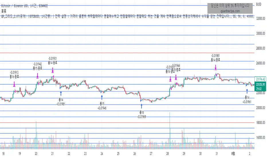 파란선의 가장 위에 회색 점선을 통과하면 포지션이 전부 종료가되고 다음봉에 다시 새로 그리드 트레이딩을 다시 시작합니다.