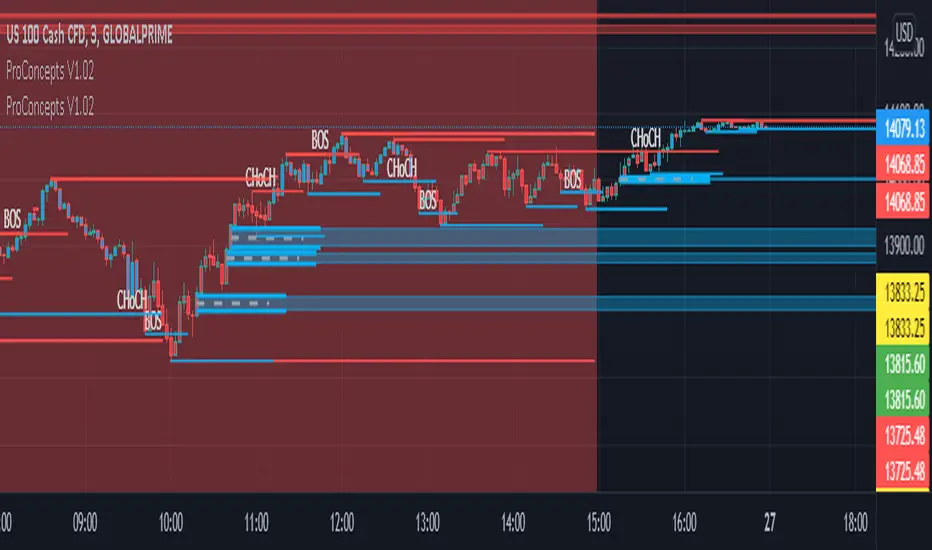 ProConcepts is a smart moeny concepts indicator that has several primary functions and features.BOS Feature: BOS stands for break of structure and this is used to determine market structure support and resistance breakouts. The blue and red lines plot the pivot highs and lows on every time frame. When a trend is in a single direction and BOS appears, that is a strong sign that market structure is broken and the trend will continue.