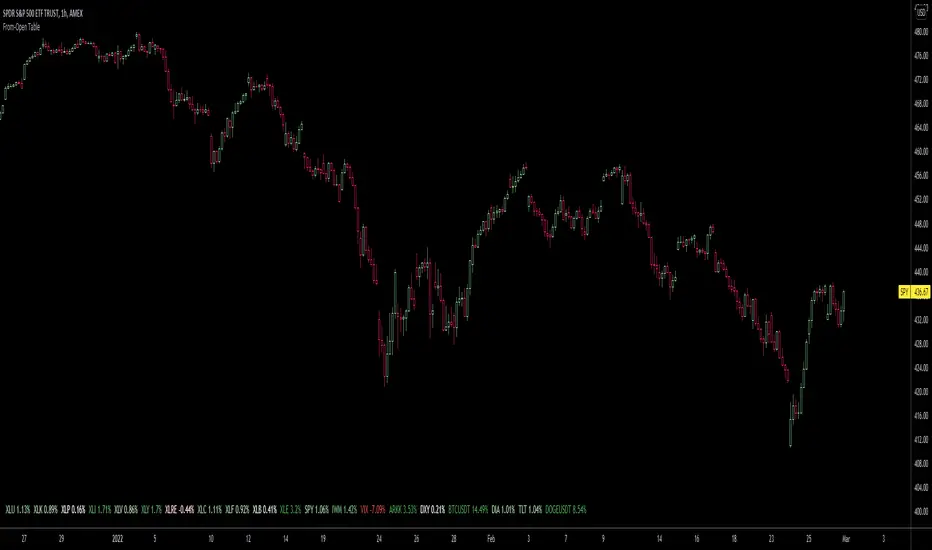 This indicator plots the percentage performance from the open of up to 20 different customizable tickers.