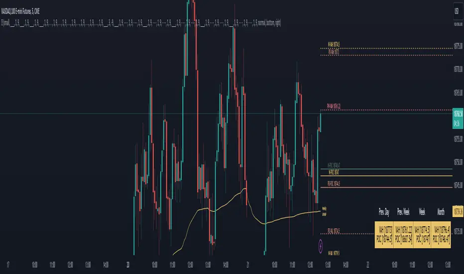 The Levels indicator automatically draws important market pivots based on multiple timeframe value zones and pivotal trading areas. This information is displayed in front of the price, to keep things out of the way of your price action chart. All of these levels are fully customizable, for visual tranquility, and all values are available to set alerts on. Last but not least is an easy-to-read dialogue box so you know exactly where you are in the auction at a quick glance to save you time while analyzing charts.